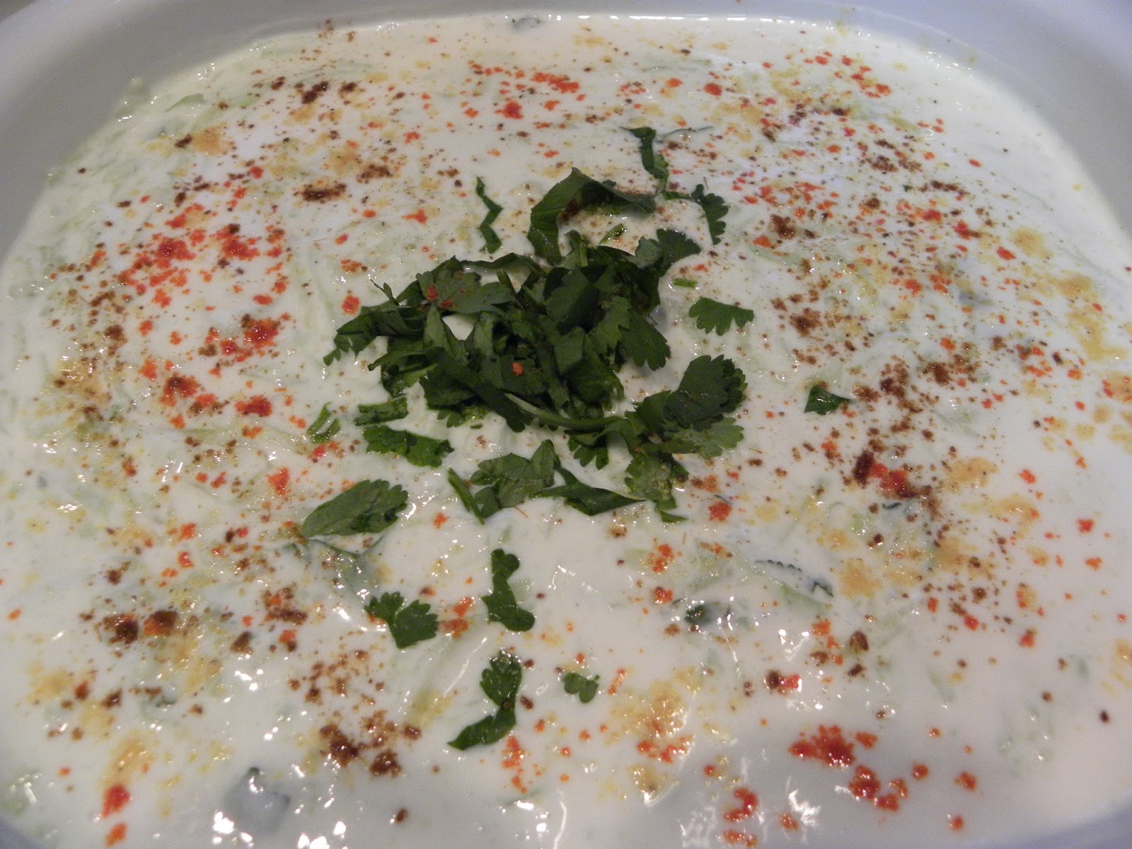 Raita is a healthy compliment to any meal. A typical meal is not complete without raita. Raita is made of yogurt combined with different vegetables and/or fruits. The combination of Yogurts’ probiotics and fresh cucumber with vitamins has a soothing affect on the digestive system against the highly seasoned foods. Variations can be made by substituting fruits and other vegetables.