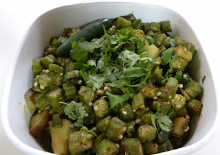 - Add the okra and stir fry for couple of minutes.