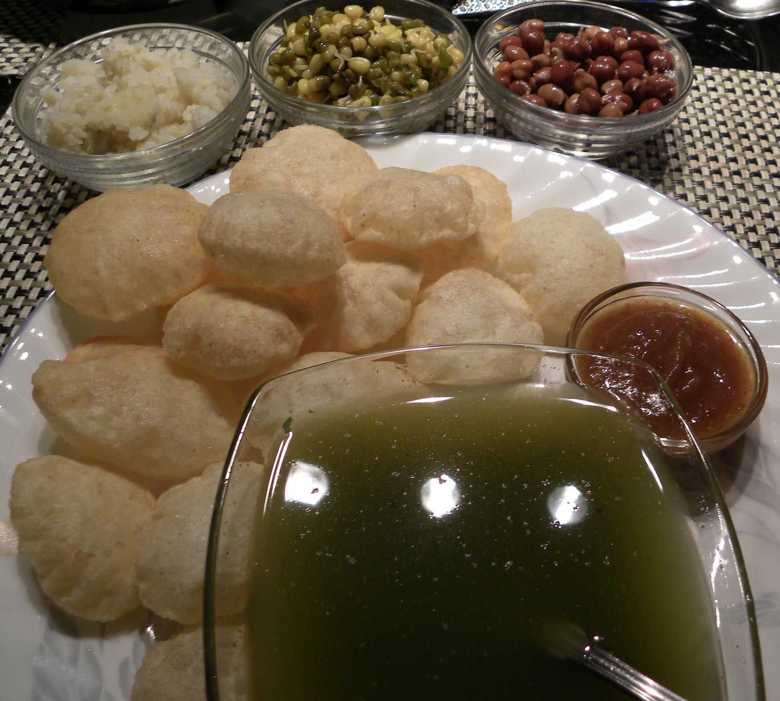 Pani Puri with Potatoes, Mung Beans, Chickpeas and Date Sauce |