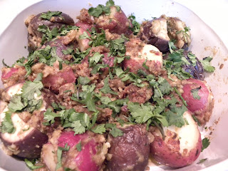 - Mix all the ingredients and fill in the slits in eggplant and potatoes.